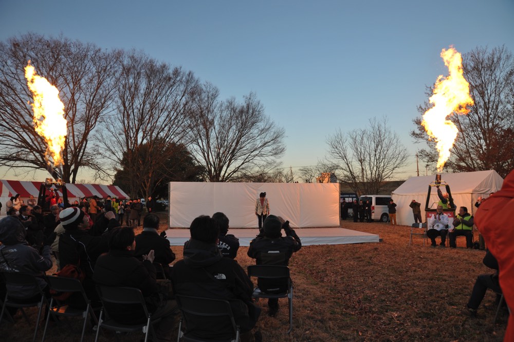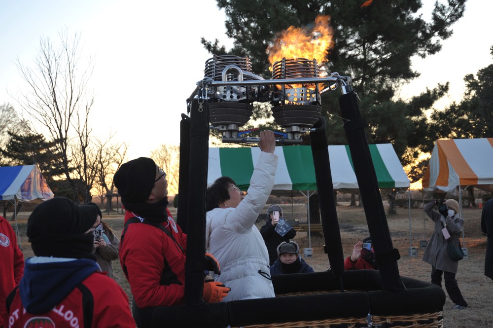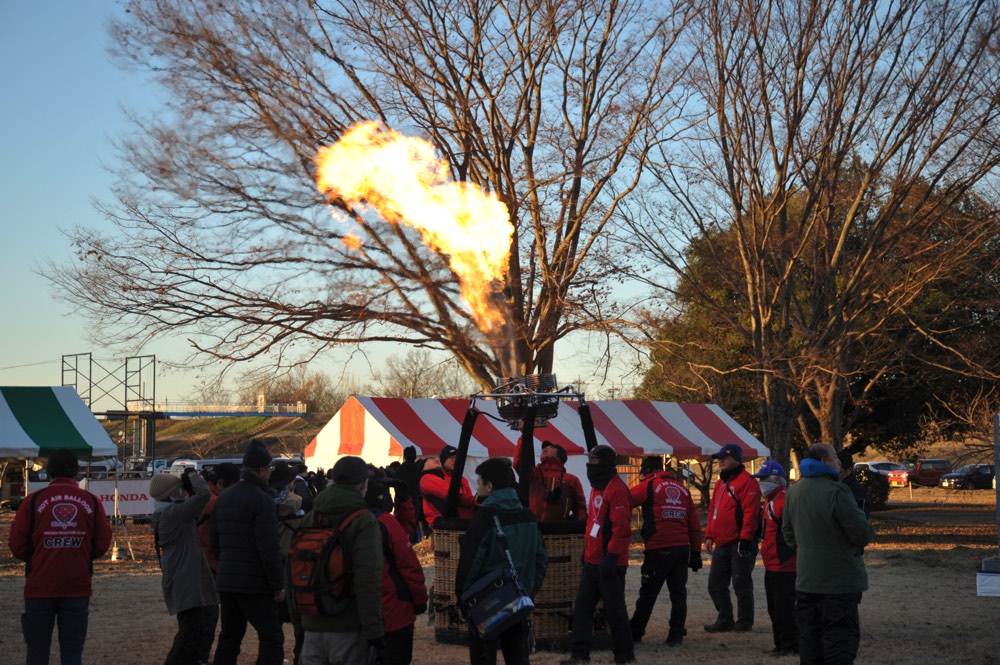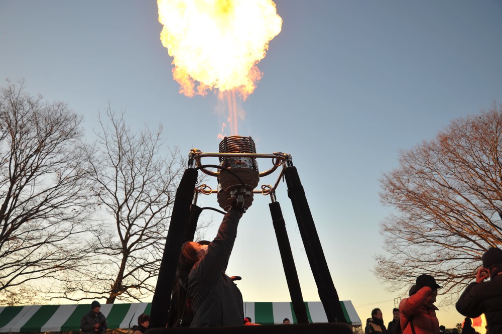 残念ながら初日は風が強く、競技飛行が中止となりましたが式典のあとには、来場者のみなさん向けに熱気球のバーナー体験も実施しました。